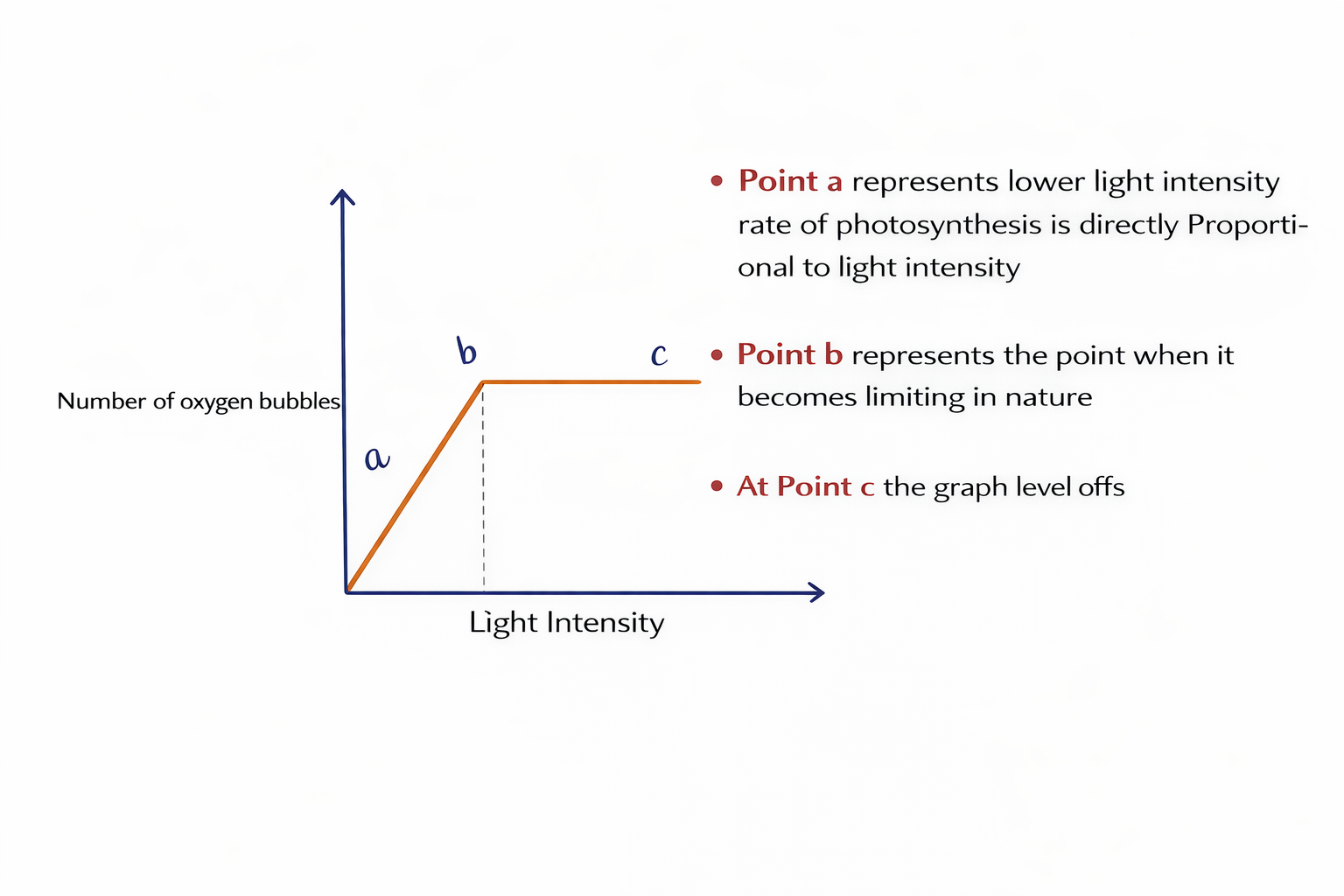 When results are plotted on a graph with light intensity on x-axis and number of bubbles of oxygen on y -axis, students usually observe the following pattern:
